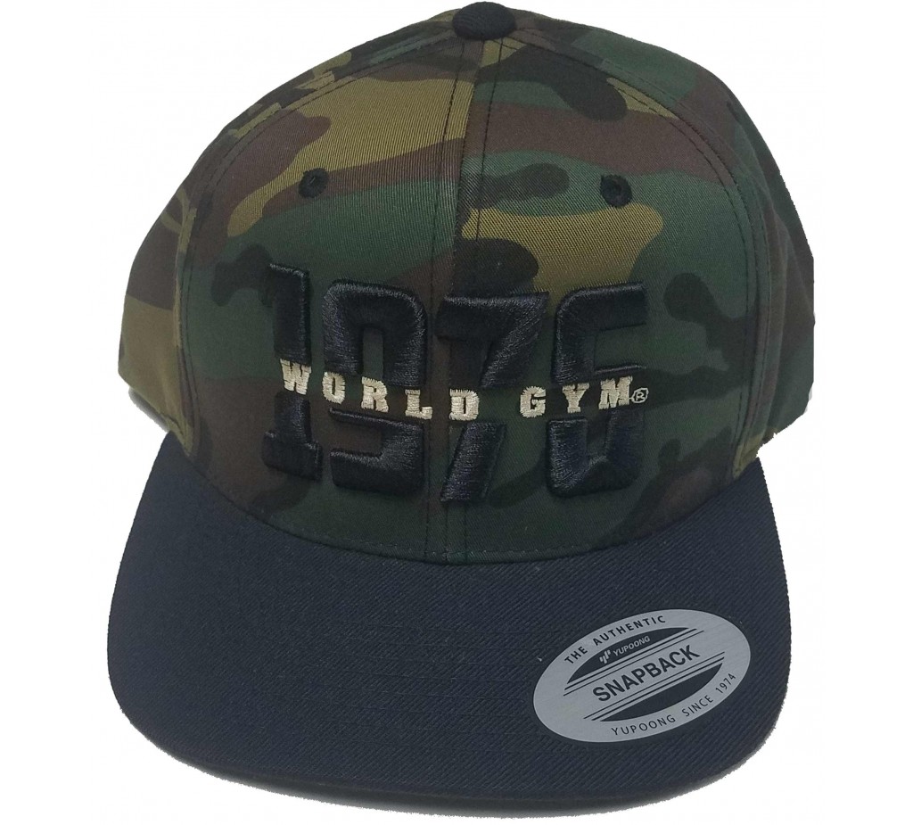 Logotipo oficial de World Gym Sombrero de béisbol CAMO. & nbsp; Disponible en 2 tamaños: M para tamaño pequeño a promedio y L para tamaño más grande.