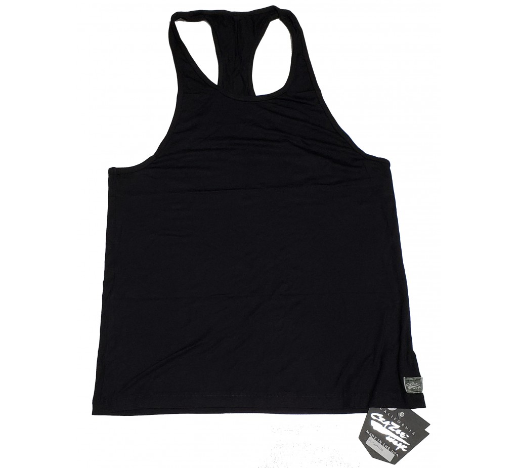 A mens racerback tank top with a T-back cut from Crazy Wear workout clothes.  Made from 96% Rayon /4% spandex fabric with the Crazee Wear name patch stitched to the lower edge of the workout tanktop.  This racerback tank top is available in black.